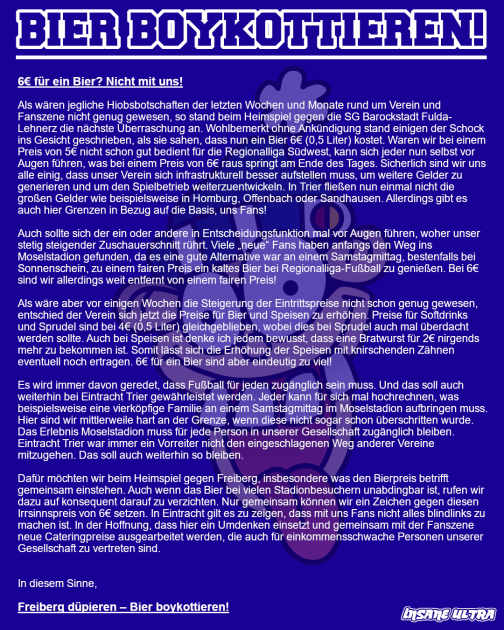 Als wären jegliche Hiobsbotschaften der letzten Wochen und Monate rund um Verein und Fanszene nicht genug gewesen, so stand beim Heimspiel gegen die SG Barockstadt Fulda-Lehnerz die nächste Überraschung an. Wohlbemerkt ohne Ankündigung stand einigen der Schock ins Gesicht geschrieben, als sie sahen, dass nun ein Bier 6 € (0,5 Liter) kostet. Waren wir bei einem Preis von 5€ nicht schon gut bedient für die Regionalliga Südwest, kann sich jeder nun selbst vor Augen führen, was bei einem Preis von 6€ raus springt am Ende des Tages. Sicherlich sind wir uns alle einig, dass unser Verein sich infrastrukturell besser aufstellen muss, um weitere Gelder zu generieren und um den Spielbetrieb weiterzuentwickeln. In Trier fließen nun einmal nicht die großen Gelder wie beispielsweise in Homburg, Offenbach oder Sandhausen. Allerdings gibt es auch hier Grenzen in Bezug auf die Basis, uns Fans!